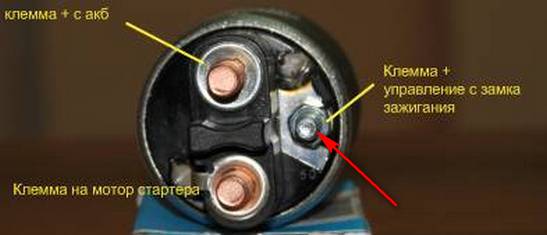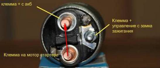 Якщо при старті двигуна стартер не крутиться, але при цьому чутні клацання, першим ділом слід діагностувати саме реле. Воно підключається до акумуляторної батареї і замку запалювання через 2 кабелю. Один з них (толстого перерізу) йде з позитивної клеми батареї, а другий (тонкого перетину) направляється з позитивної клеми управління замку запалювання. Є у реле і третій висновок (толстого перерізу), який з’єднує його з мотором стартера.