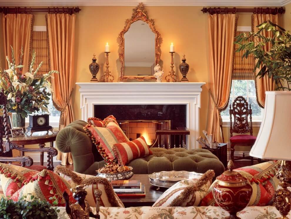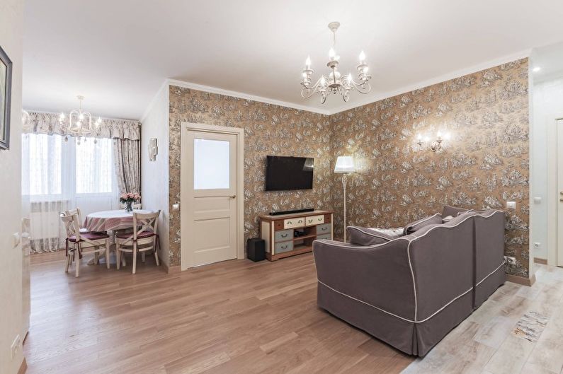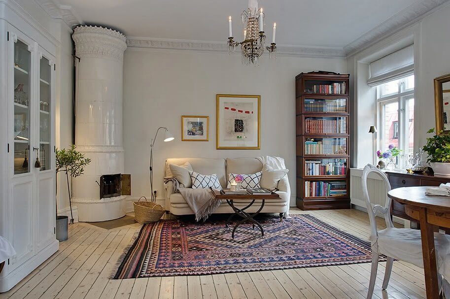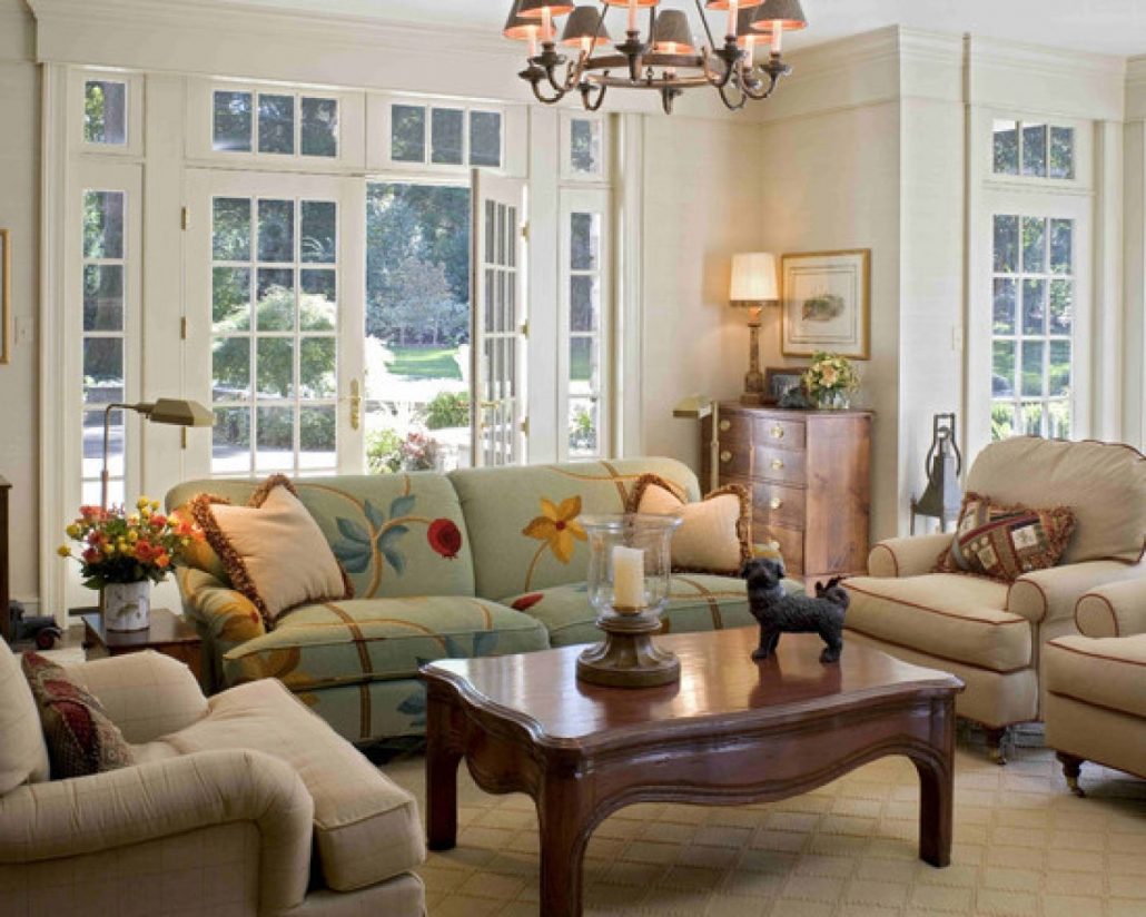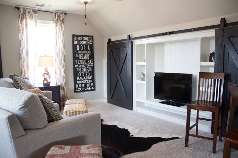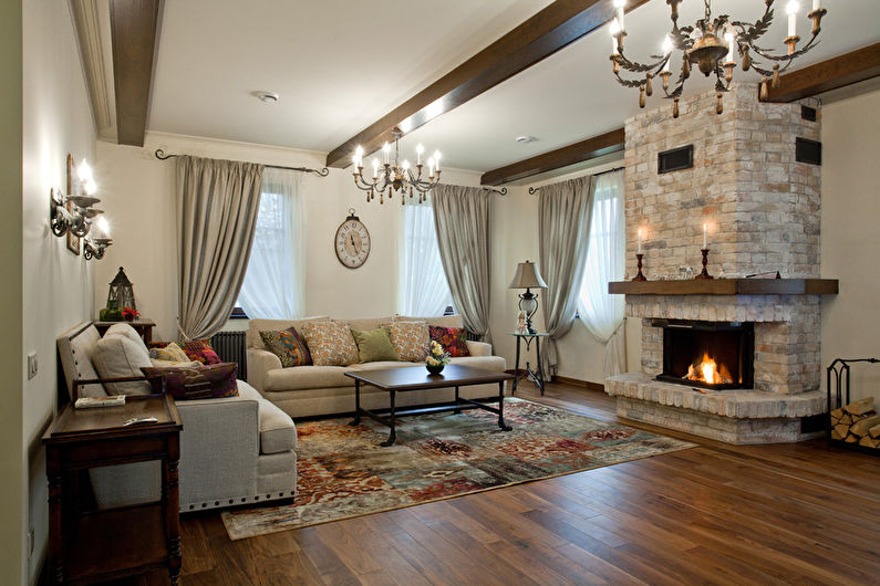 Для зонування приміщення використовуються крісла або стелажі. Декорувати вітальню можна кованими свічниками, стильним кашпо йди фігурками з глини або бронзи. Додатково використовують картини, килими з візерунком, фотографії або аксесуари, зроблені своїми руками.