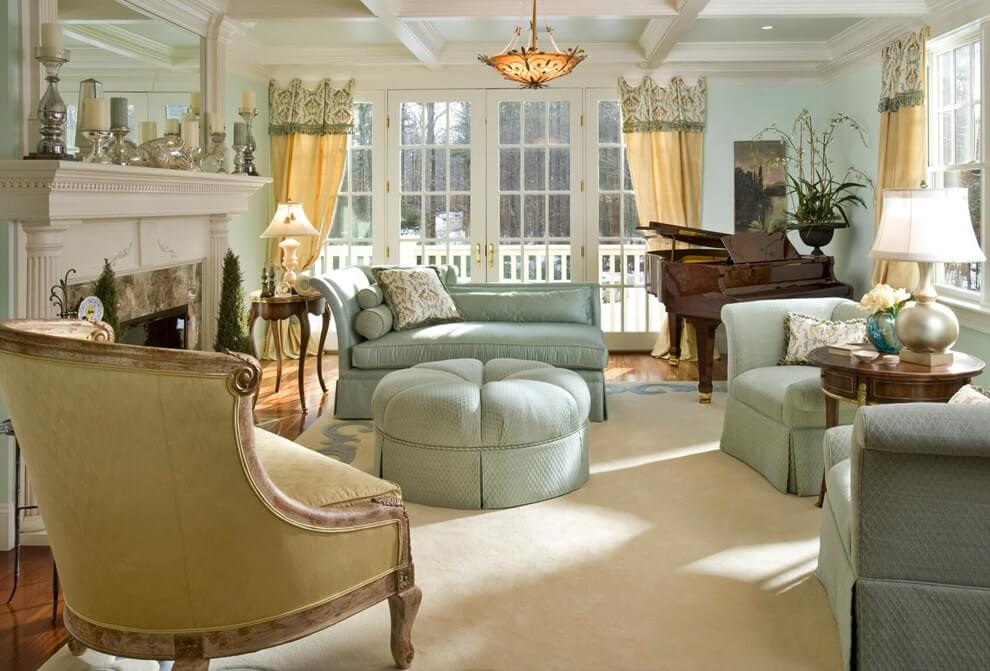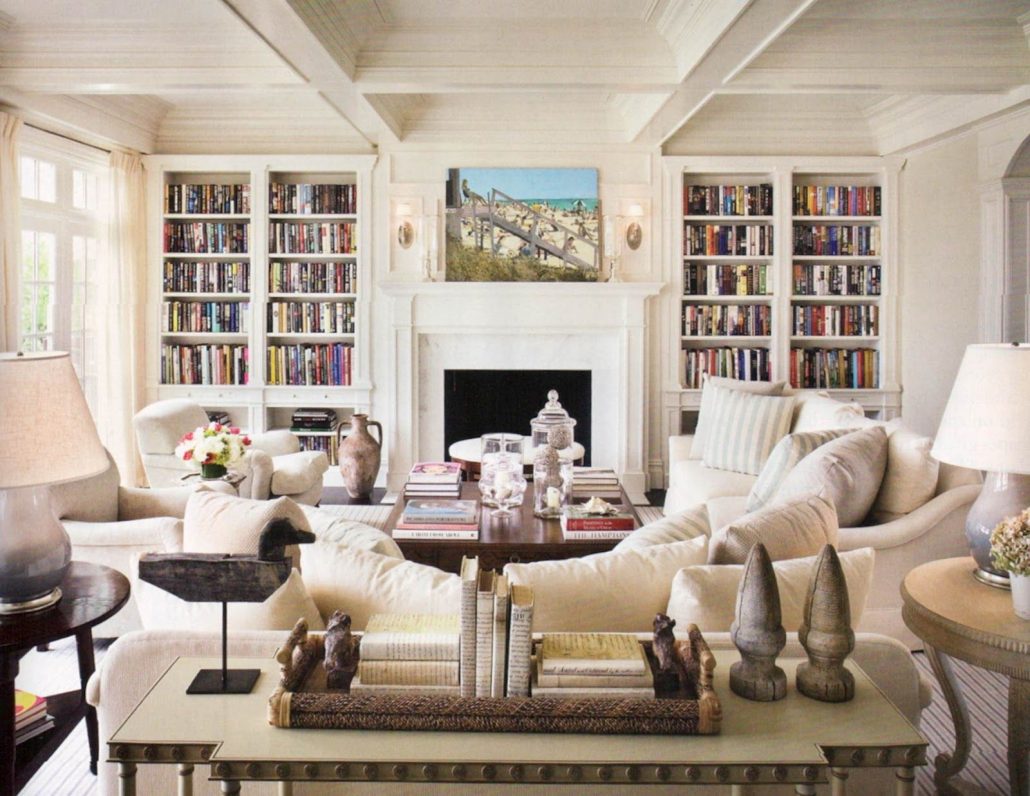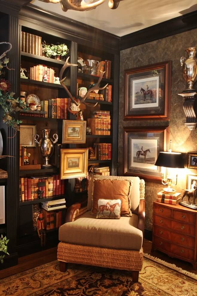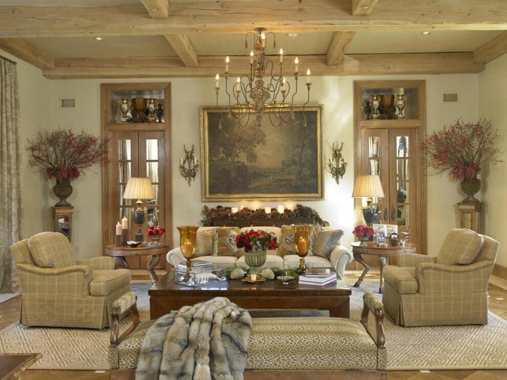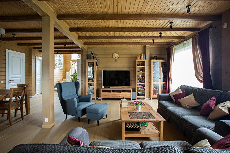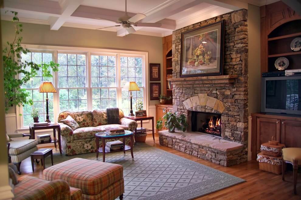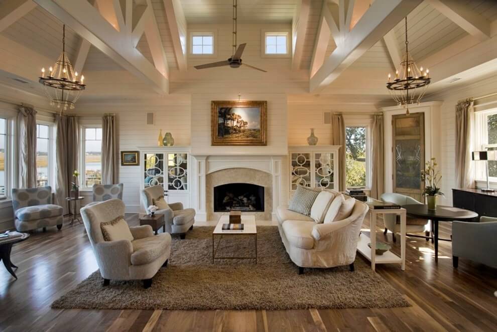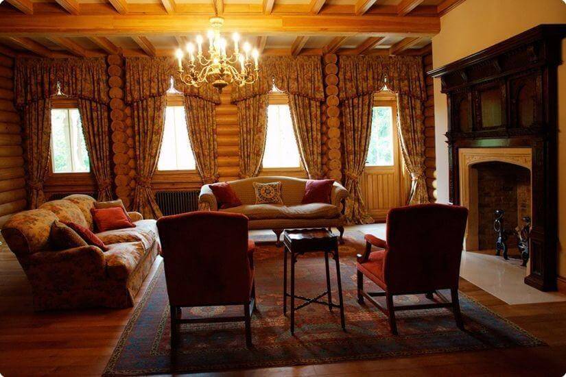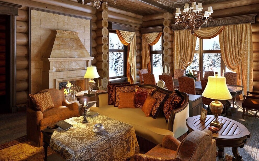Ця кімната повинна стати візитною карткою будинку, тому при її оформленні варто докласти максимум зусиль. Тому тут можна розмістити камін, стіл, зроблений вручну або бібліотеку. Підлогу можна викласти декоративним каменем, а на стінах закріпити дерев’яні балки.