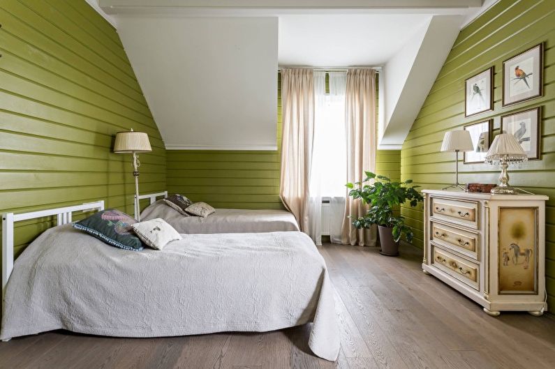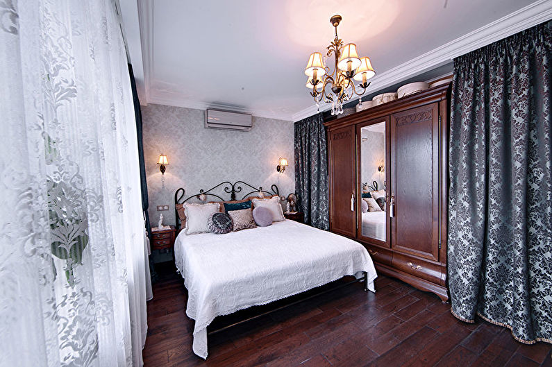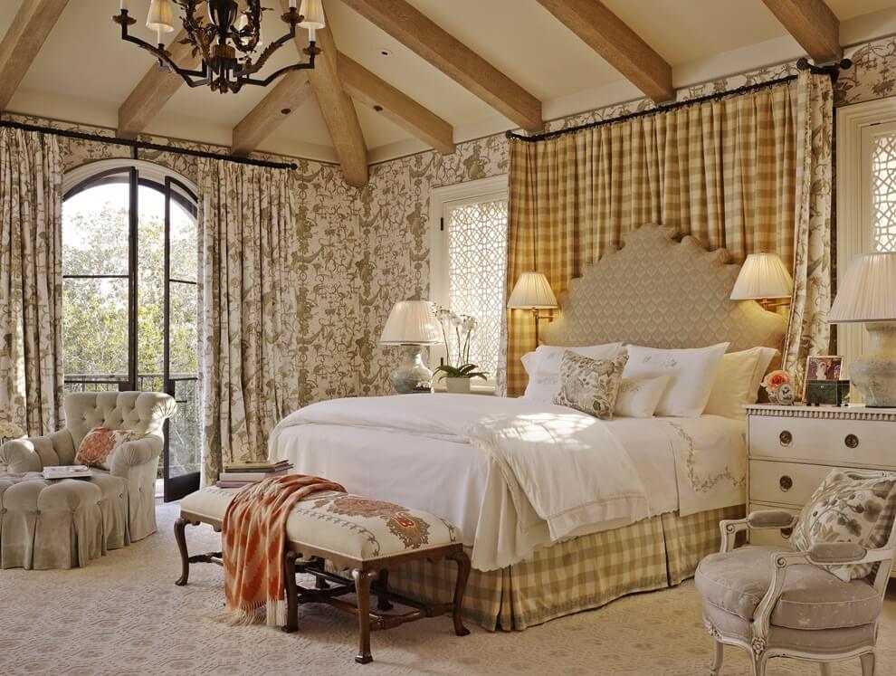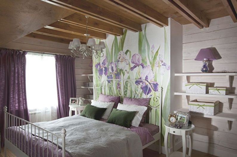 Спальня в даному стилі стане самим тихим і затишним куточком квартири. Важливо, щоб стеля була світлим і однотонним, в той час як для оформлення стін можна використовувати геометричні або квіткові візерунки, дерев’яні балки і т. д.