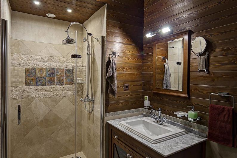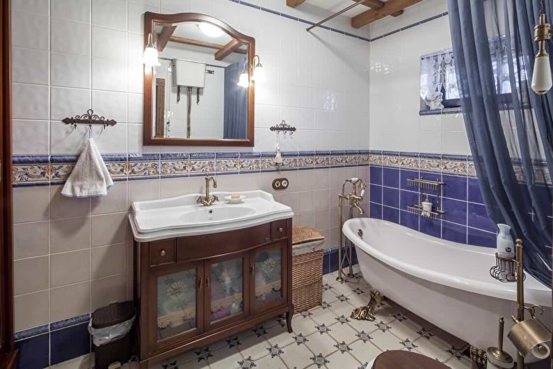 У ванній відмінно виглядатимуть ковані вішалки для рушників та модульні меблі. Для облицювання підлоги та стін використовується камінь або плитка світлих тонів. В якості декору вибирають постарені дзеркала, глиняні мильниці, килимки з натуральних матеріалів.