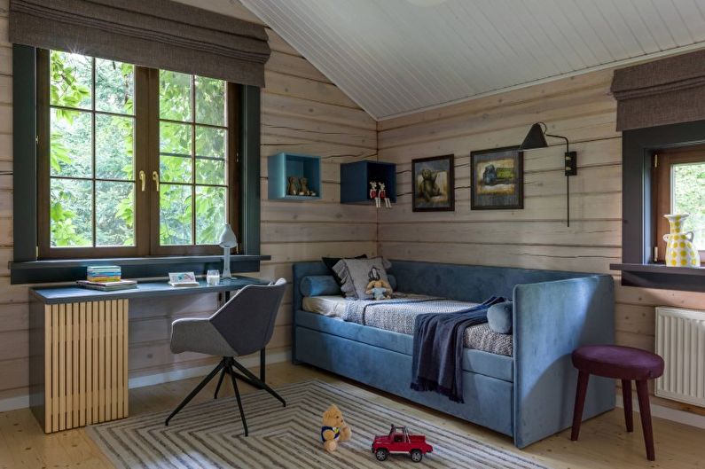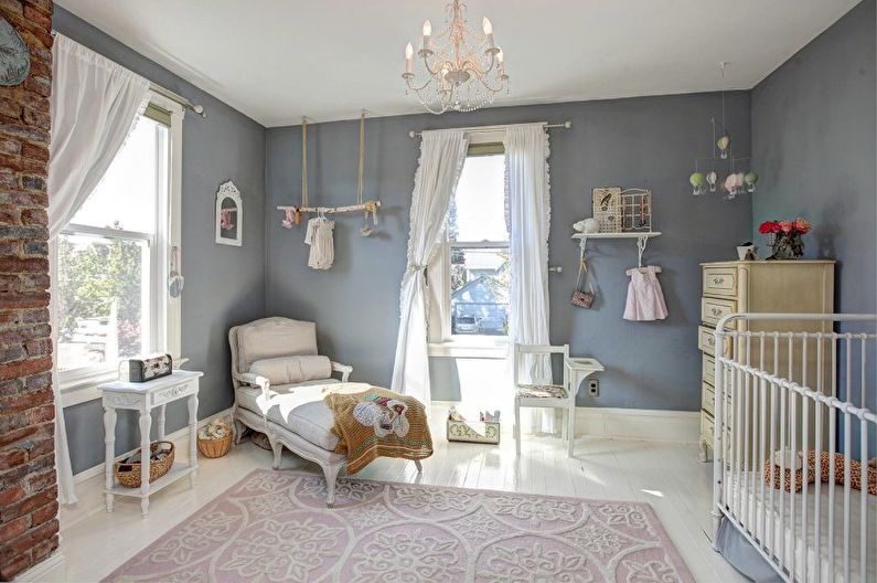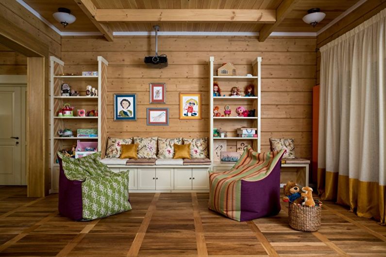 Теплі відтінки, меблі з натуральних матеріалів, книжкові стелажі та інші елементи, характерні для стилю кантрі, стануть ідеальним варіантом для оформлення дитячої кімнати. Прикрасити приміщення допоможуть фігурки з глини, валяні іграшки, вінтажні дерев’яні скрині, в яких можна зберігати речі і іграшки, красиві дитячі малюнки і постарені дзеркала.