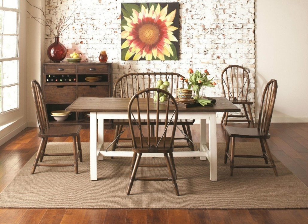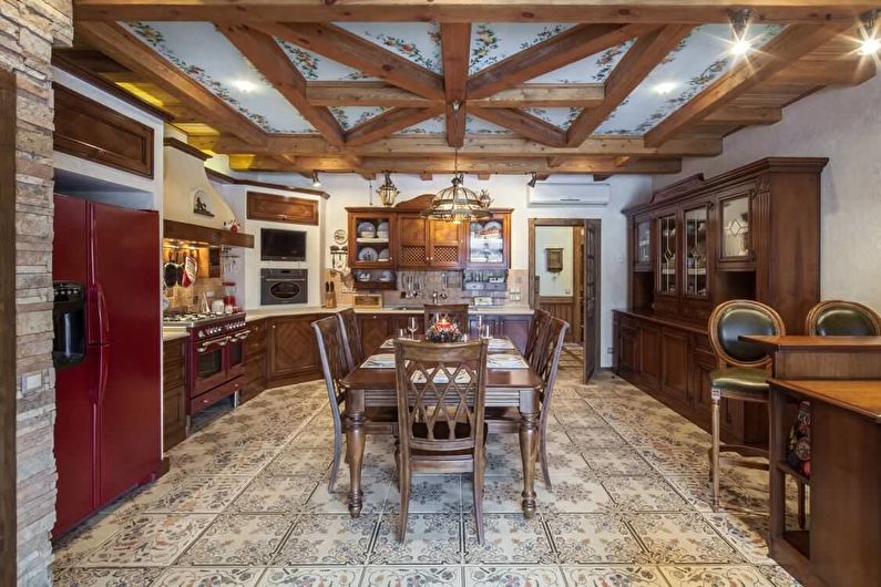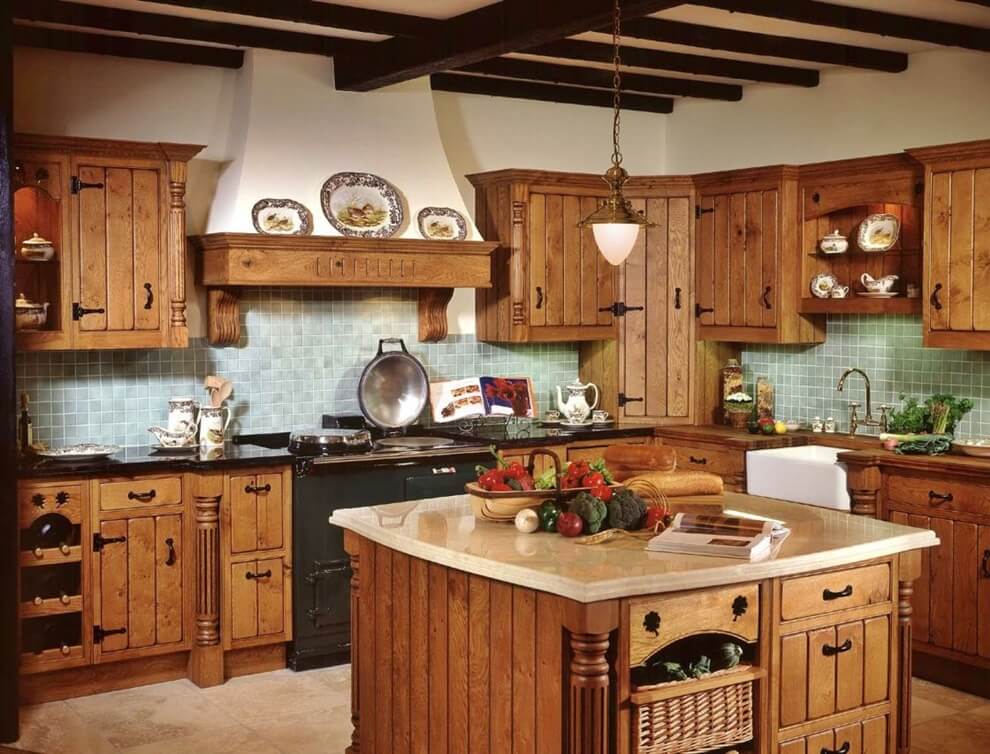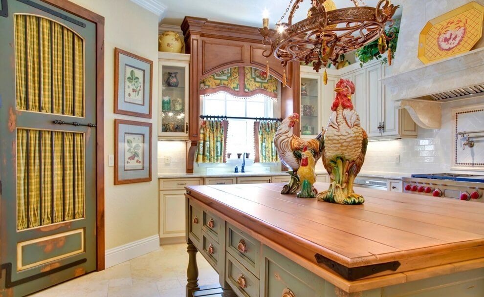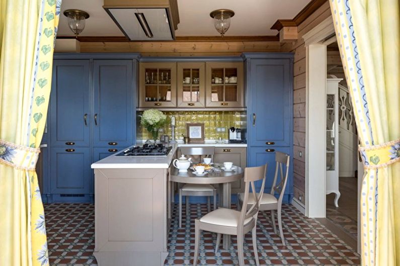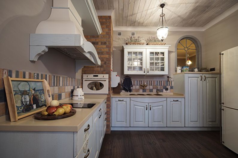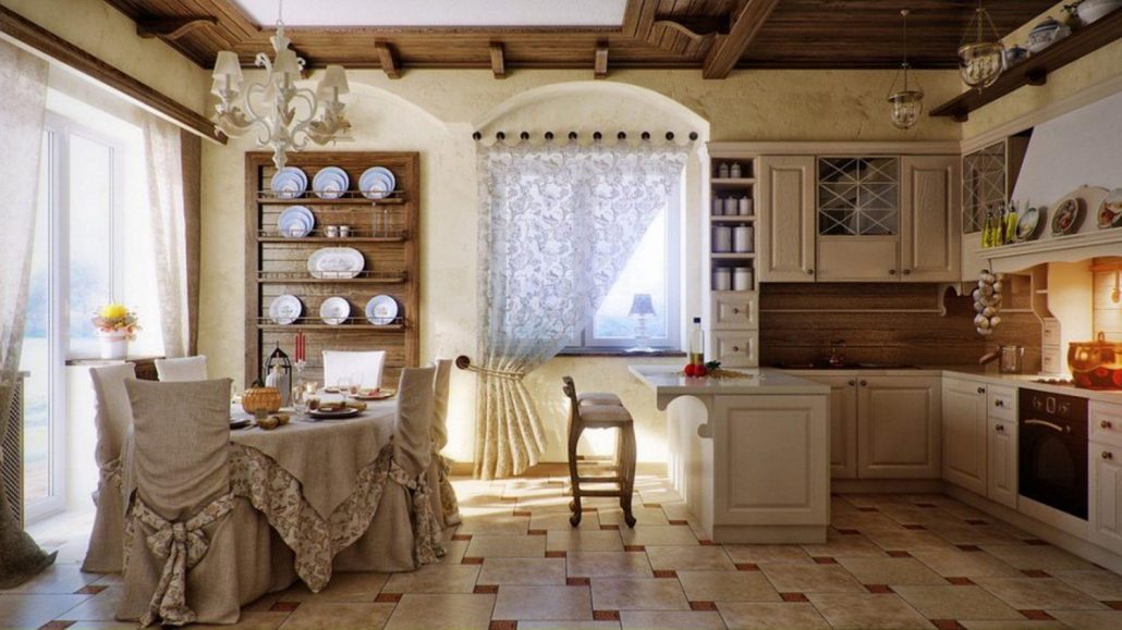 Кухня в цьому стилі повинна бути простою і виглядати максимально природно. На вікна можна повісити фіранки з бавовни, прикрашені стрічками. Стіл обов’язково слід накрити скатертиною, вишиту вручну. Стільці повинні мати м’які сидіння. А для освітлення ідеально використовувати люстру з кованим підставою. Для декору використовують картини із зображеним на них натюрмортом, глиняні вази керамічні тарілки.