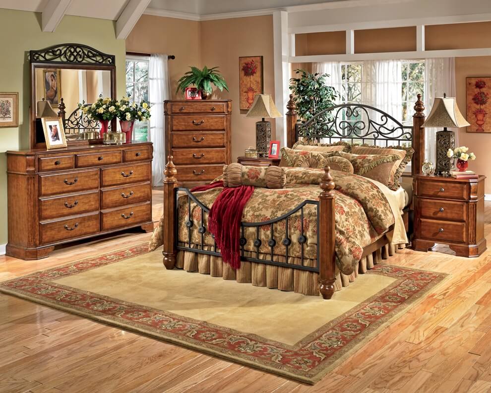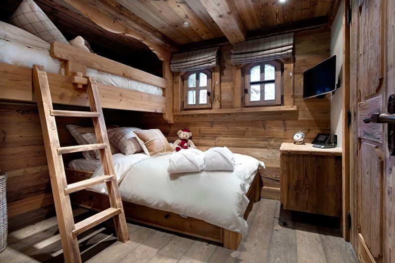У спальні не повинно бути занадто багато меблів. Варто обмежитися великим ліжком, туалетним столиком з металевими елементами і плетеним кріслом. Декорувати спальню можна використовуючи картини із зображенням красивих пейзажів, настільну лампу, практичний текстиль. Це можуть бути килими, зроблені вручну, покривала з клаптів або ковдри з вовни.