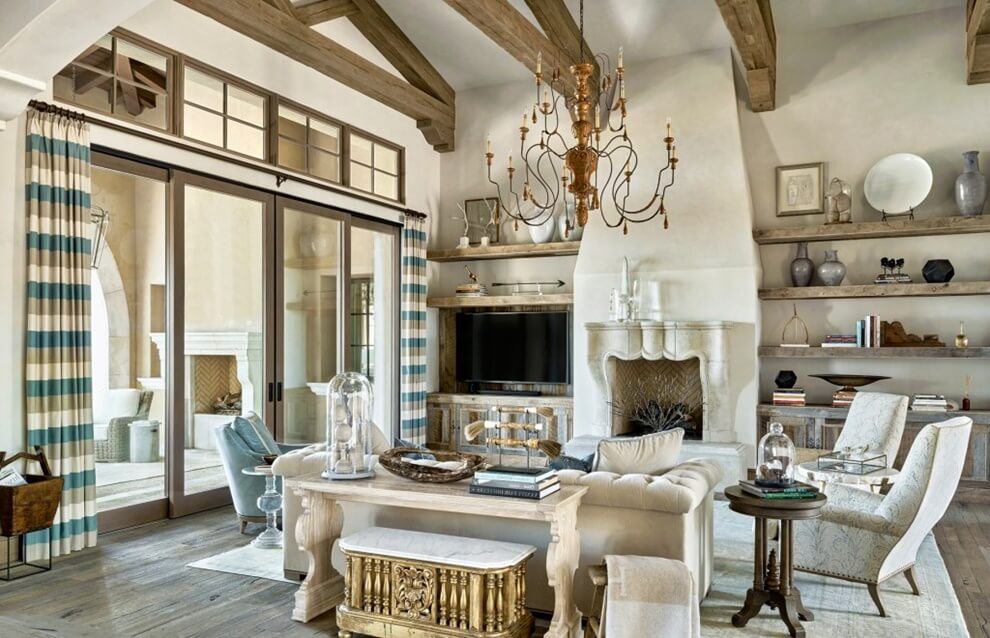 Декоруючи стеля в стилі кантрі, перевагу найчастіше віддається дерев’яних балках, які ефектно виглядають на тлі світлих стін і можуть стати якоюсь родзинкою будинку.