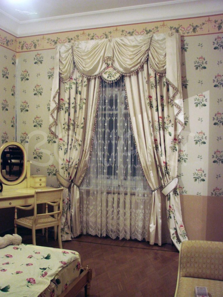 Традиційним варіантом можна вважати розсувні портьєри з ламбрекеном з шовку. Вони можуть прикрашатися кистями, бахромою і збиратися шпильками.