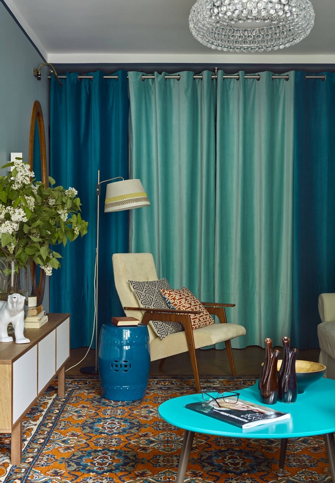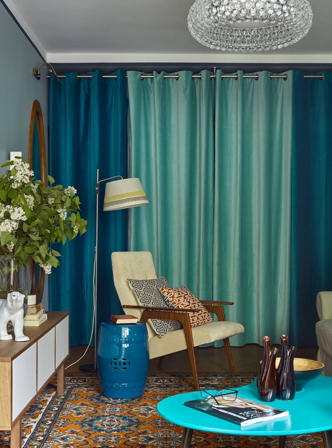 Сьогодні популярні довгі штори насичених відтінків, які позбавлені блиску і нагадують гуаш. При цьому тюль може повторювати відтінок портьєр, тільки сильно розбавлений або ж бути повністю прозорою.