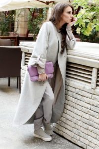 Кашемір. За структурою дуже м’який матеріал. Надає виробу елегантності, на дотик приємний. Відмінно виглядає з ніжними відтінками, робить образ повітряним. Як правило, такі вироби мають підкладку, що дозволяє носити пальто навіть у холодну пору. Рекомендовано такі моделі носити з сукнею, спідницею, доповнюючи мінімалістичним чобітками.