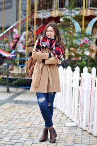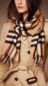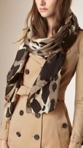 Більш цікаве рішення – шарфи з незвичайним принтом або візерунком. У моді геометричні візерунки, клітина, смужки. Бежеву верхній одяг краще розбавити шарфом з яскравою кольоровою гамою (червоно-чорною, зеленою або синьою):