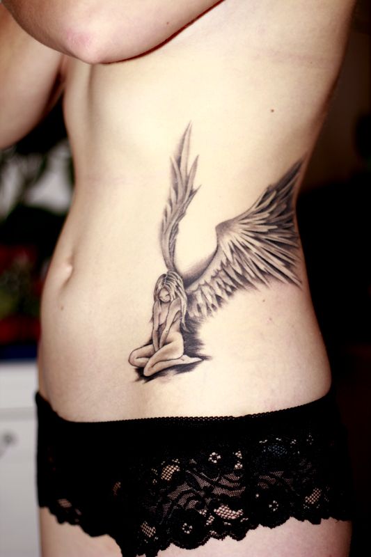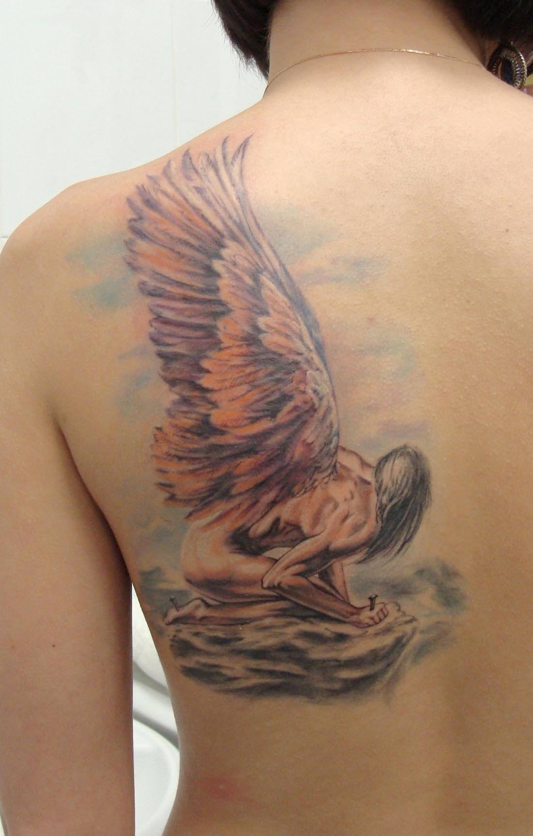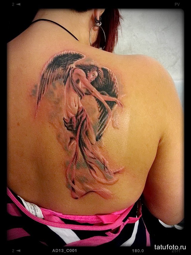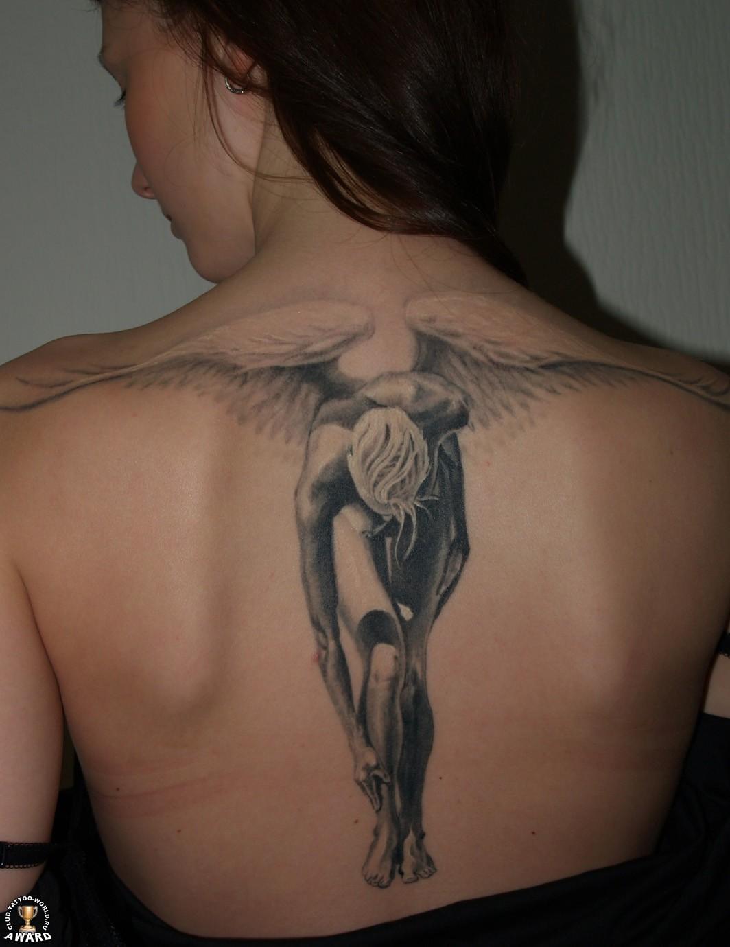 Зображення на тілі ангела з розправленими крилами показує готовність дівчини до серйозних змін в житті. Якщо наколоти летить ангела, то це стане символом духовного переродження. А ось зображення занепалого ангела свідчить про розбилися надії і втрати віри в майбутнє. Пропащий ангел і ангели смерті нагадують оточуючим про те, що життя потрібно цінувати тут і зараз, бо потім буде пізно. Дівчата, які вчинили помилку на своєму життєвому шляху, роблять татуювання занепалого ангела з метою покаяння. Дивлячись на неї, вони ніколи більше не здійснять проступків.