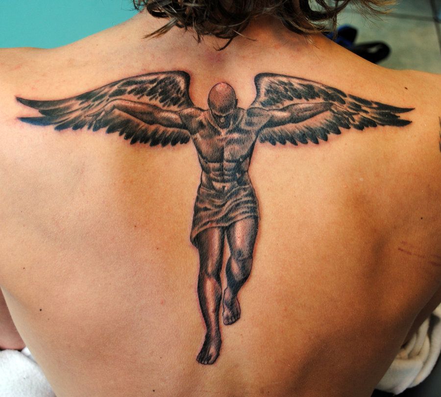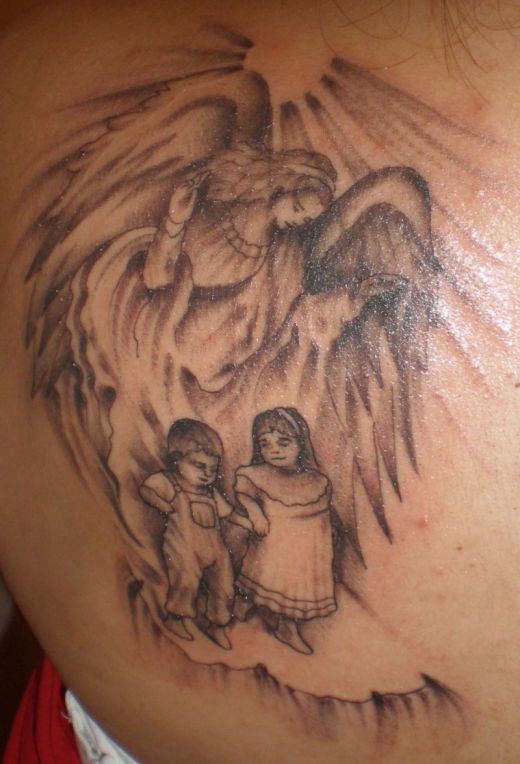 Здавна жителі племен вірили в буття певних посланців, які взаємодіяли з людиною і божеством. На їхню думку, посланці спускалися на землю у вигляді птаха і допомагали людині стати на істинний нехай, просвіщали його або допомагали перетнути міст в духовний світ. Історія змінювалася день за днем і замість священних птахів з’явилися ангели. Еволюційний релігійне перетворення створило образ ангела у вигляді людини з крилами. Вони символізували захист і зображувалися з певним предметом в руках, наприклад, з цибулею, арфою, палицею та ін. З ангелом асоціюється невинність, віра і добрі думки. На тілі татуювання у вигляді ангела виглядає естетично і трактується безліч смислових значень.