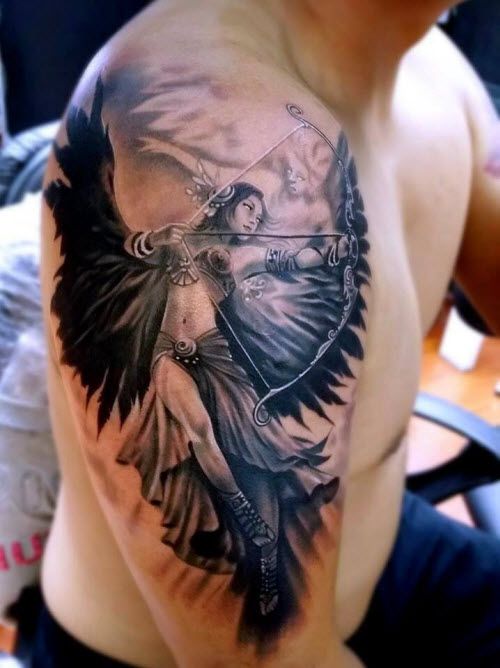 Певний сенс вкладається в значення татуювання з ангелом, який зображений спільно з якимись незвичайними деталями. Іноді ангельська атрибутика зображується окремо. Зв’язує з ангельською тематикою, стріла дуже часто є вибором татуювання для молоденьких дівчат. В реальності стріла на тілі символізує приховане бажання своєї власниці закохатися. На думку багатьох фахівців, татуювання зі стрілами або Купідонами характеризують дівчат з позитивної сторони. Їх характер урівноважений, прямолінійний і вони завжди досягають бажаного.