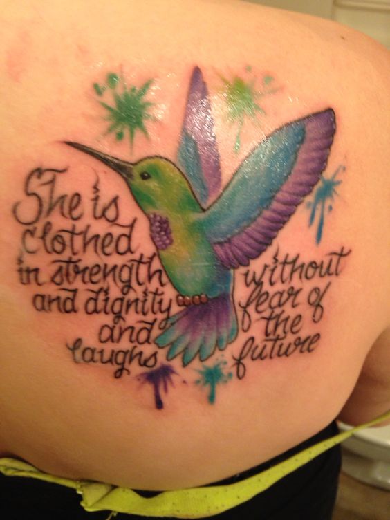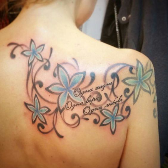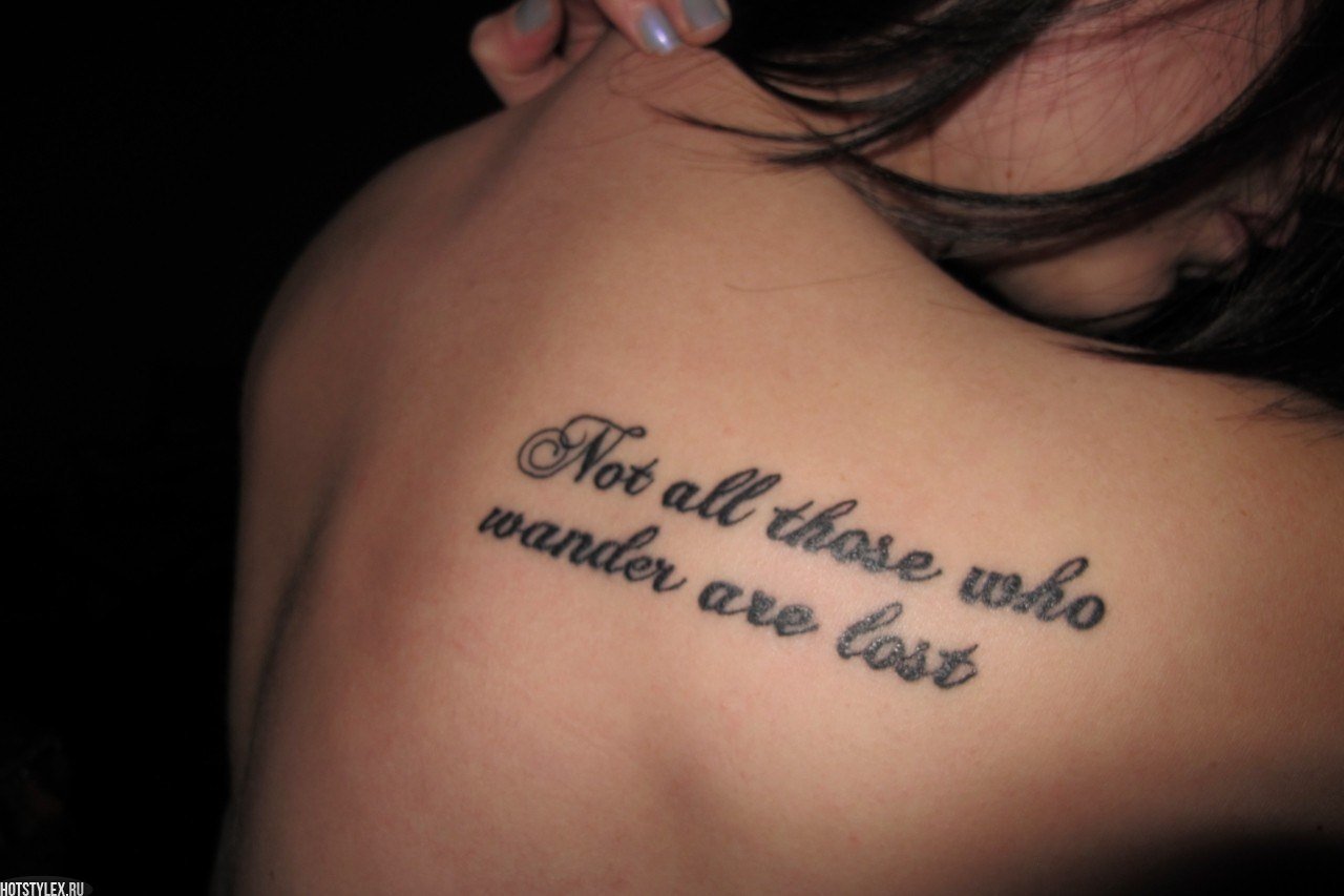 Татуювання на лопатці, доповнені текстовою написом – дуже поширений варіант у жіночого населення. Перед походом до тату майстру, заздалегідь визначитеся з текстом, який ви хочете нанести на лопатку. Це можуть бути дати народжень дітей, імена улюблених, фрази латинською мовою, тексти літературних творів. Все, що ви напишете на лопатці, залишиться з вами на все життя.