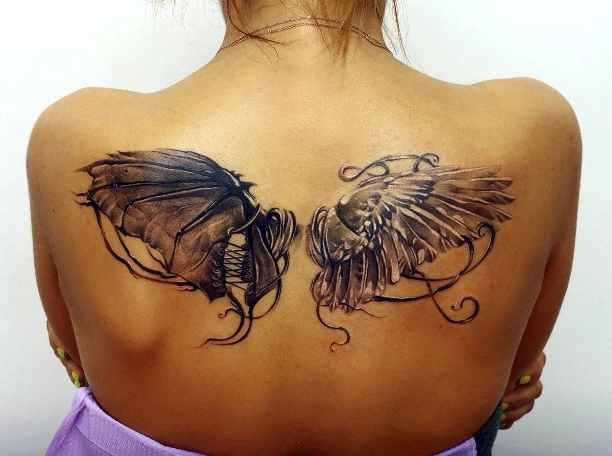Дуже часто дівчата намагаються заінтригувати оточуючим зображенням, розташованих на ділянці лопаток. Існує ряд універсальних варіантів модних тату між лопаток. Найпоширеніший з них – це ангельські крила, які по затребуваності можуть змагатися хіба що з квітковими композиціями. Дика тварина яскравими чорнилом, яке набито між лопаток теж виглядає ефектно. Найчастіше для цієї зони вибираються ескізи, які охоплюють обидві лопатки, що робить їх красивими. Вдалі приклади тату між лопаток дивіться на фото нижче.