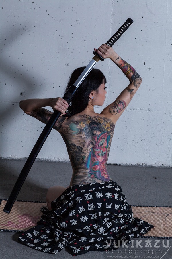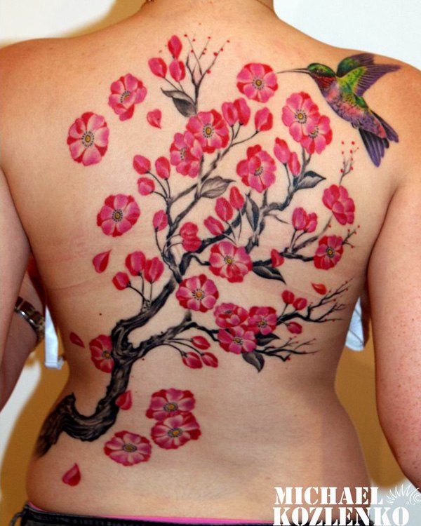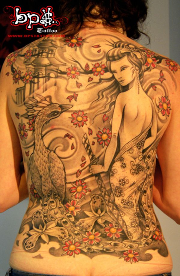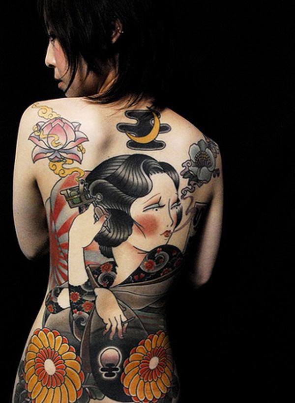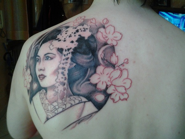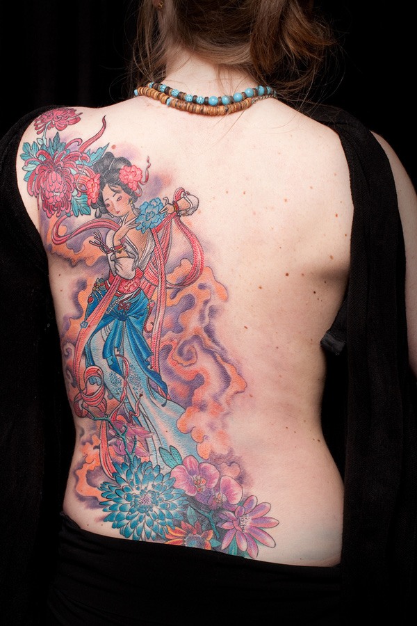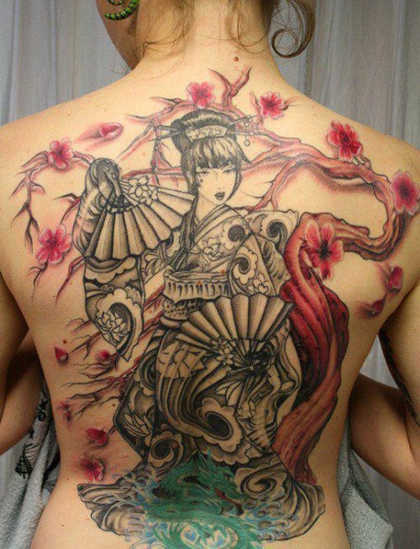 Досить поширеною тематикою у світі татуювань на спині у дівчат стали японські мотиви. Це не дивно тільки тому, що квітучі гілки сакури ототожнюються з природною красою жіночого тіла. Гейша уособлює ніжність і молодість. У таких татуювання на спині існує певний прихований контекст того, що молодість минає швидко, а тому необхідно насолоджуватися дивовижними часом по повній програмі.