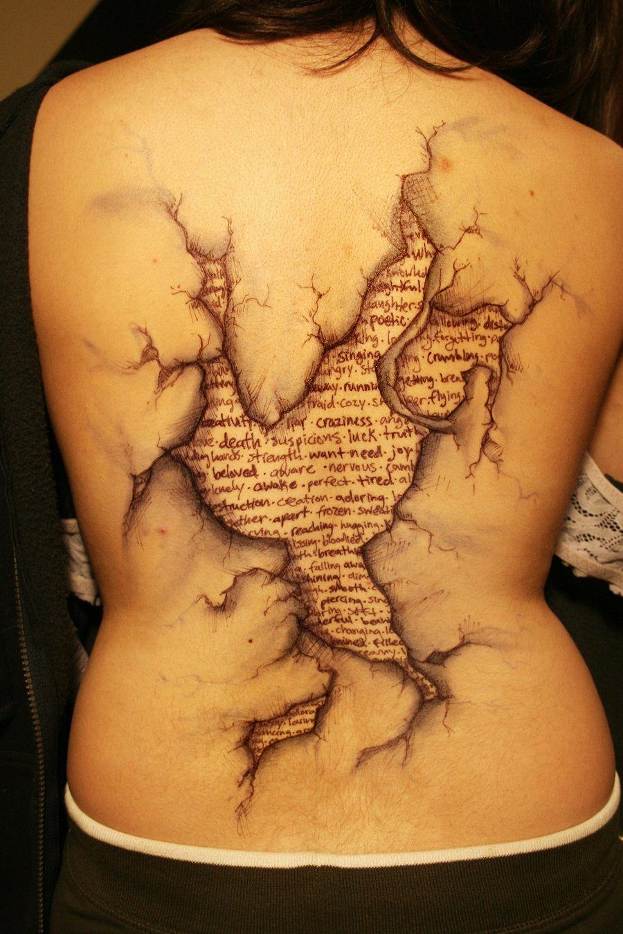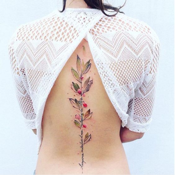 Величезну популярність у дівчат отримали татуювання у вигляді написів на спині. У багатьох написах на тілі ховається текст про чистоту, цнотливість, освіченості, досконалості. Більш оригінально на жіночому тілі виглядають чорні татуювання, ніж виконані кольоровими чорнилом. Великим плюсом татуювання на спині у вигляді напису є те, що її завжди можна сховати під одягом. Актуально для ділових жінок або тих, хто трохи говорить по життю.