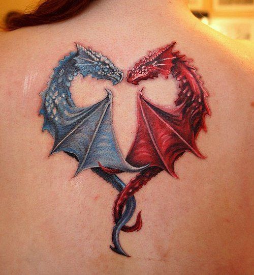 Татуювання на спині міфічних створінь ідеально підходять для свого місцерозташування. Витончені вигини спини чудово доповнюються контурами різних драконів. Значення татуювання дракона трактується в залежності від кольору виконання, але в загальному розумінні зображення міфічної істоти характеризує дівчину, як багатолику особу. Синій дракон означає спокій, відкритість, співчуття. Червоний дракон на спині показує широкі рамки емоційності та відкритості.