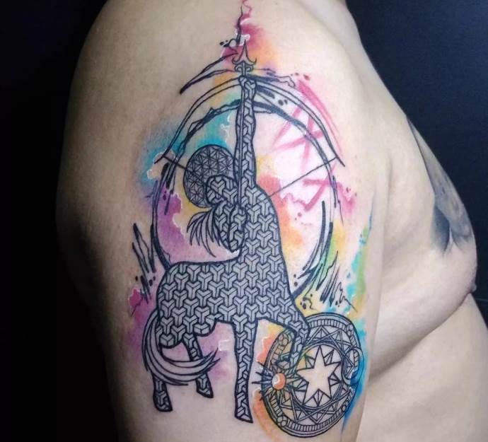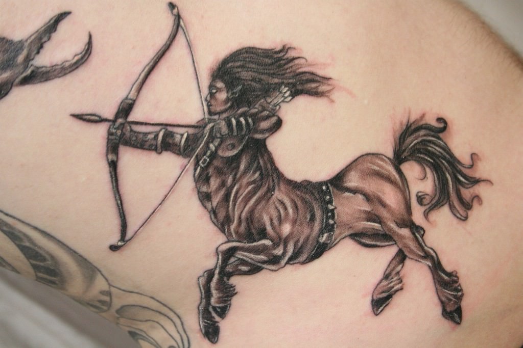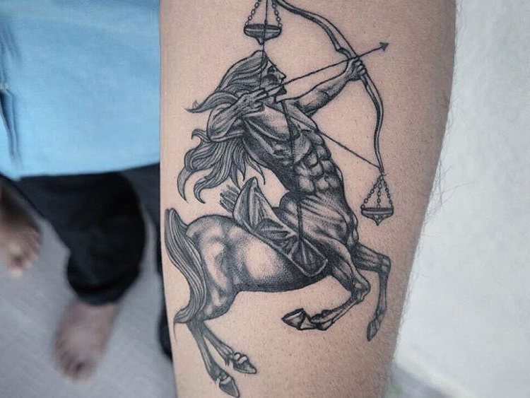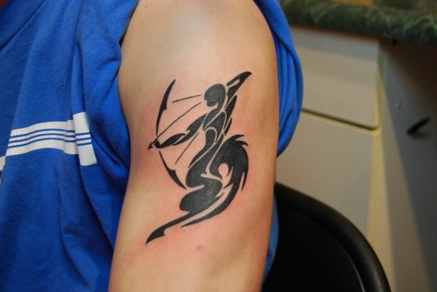 Дуже часто стрільця зображують на тілі, як кентавра з луком у руках. Також це може бути тільки лук зі стрілою або навіть сузір’я цього знака зодіаку.