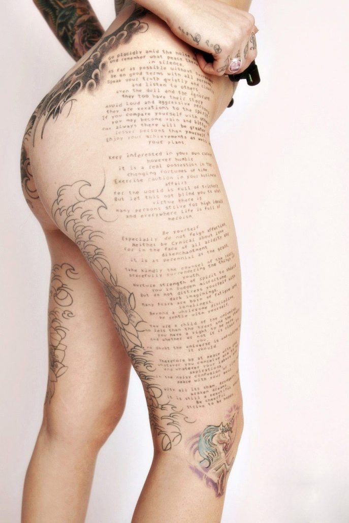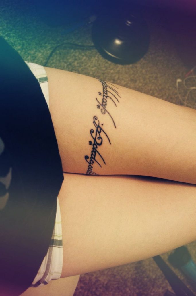 Екстравагантно такі написи будуть виглядати на щиколотці, внутрішньої або зовнішньої частини стопи або стегна. Інтимні фразу, які призначені для обраних, наносяться на верхню частину стегна.