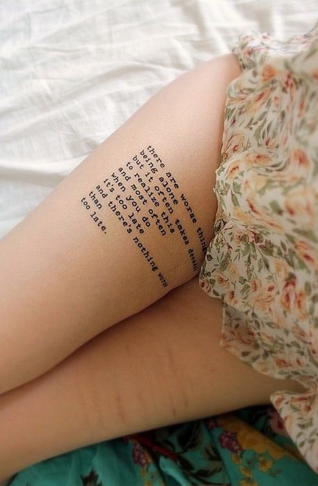 Щоб виразити свою індивідуальність, дівчина може вибрати тату у вигляді напису з життєвим девізом. Дуже часто можна зустріти напис, що символізує якусь-то дату чи ім’я коханої людини.