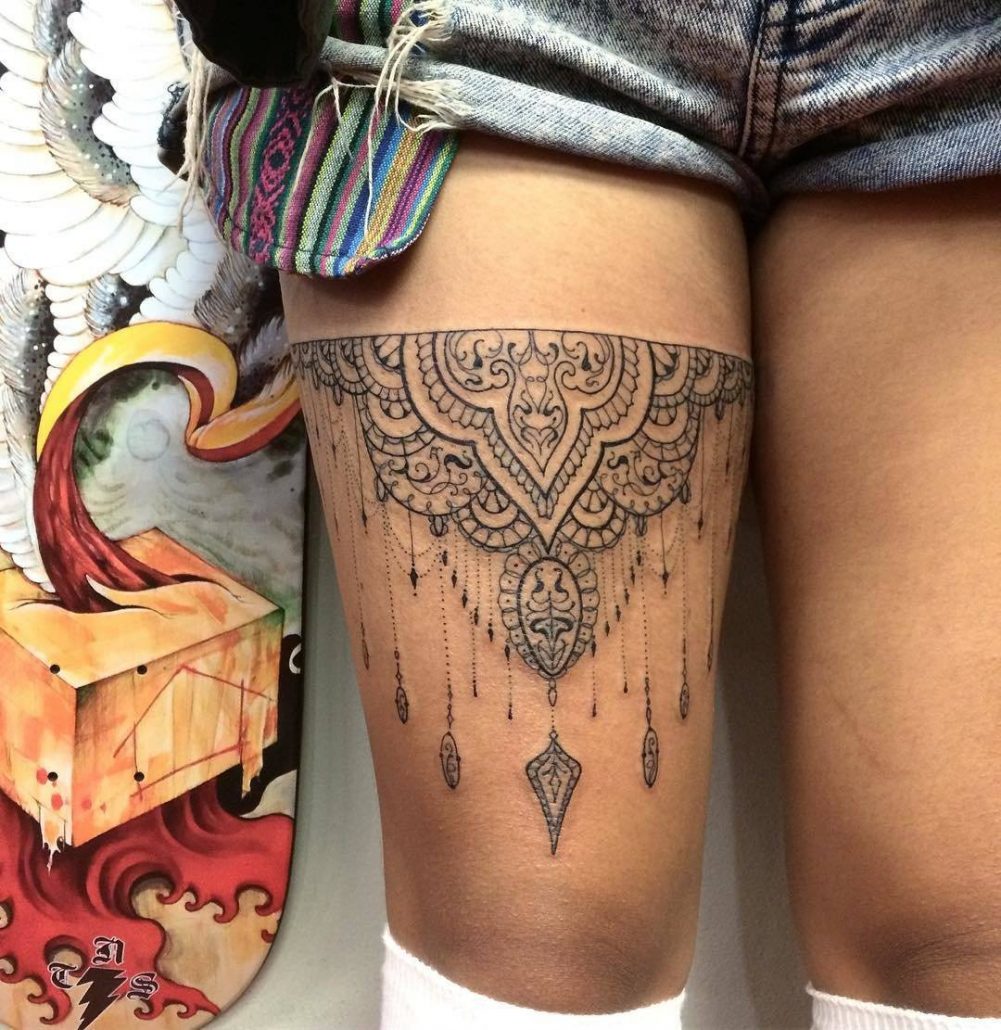 Дуже сексуально виглядає ажурний візерунок, що повторює мереживне плетиво, нанесений на поверхню стегна. На таке тату можуть зважитися тільки сміливі і розкуті дівчата. При цьому дуже важливо, щоб малюнок виглядав натурально. Намальоване мереживо може бути доповнено бантами, намистинами. Щоб досягнути глибини зображення, використовується ціла гама відтінків – від ніжних пастельних тонів до яскравих фарб.