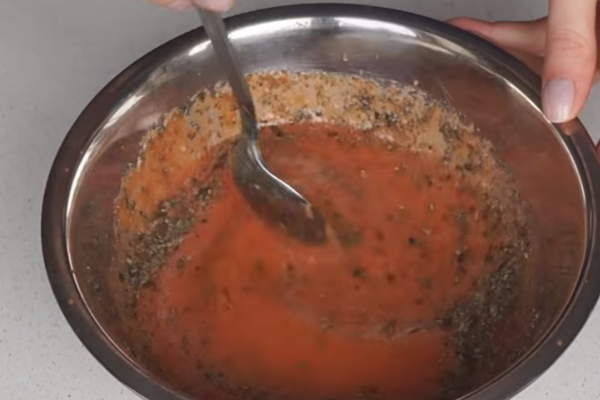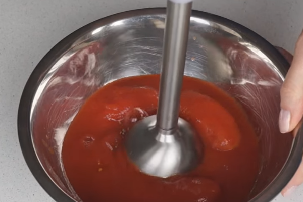 6. А поки воно настоюється приготуємо соус. Томати потрібно подрібнити з допомогою міксера.