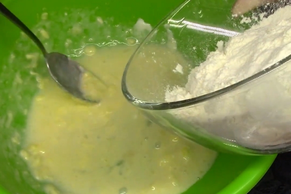 2. Всю нашу суміш перемішуємо і додаємо в неї просіяне борошно.