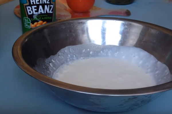 1. Беремо теплий кефір і виливаємо його в миску. До речі, був пройдений експеримент приготування, на різних % жирності кефіру і найвдаліший виявився 1%.