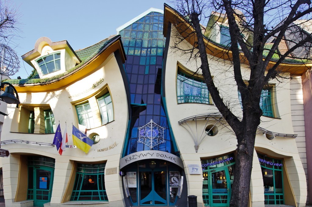 У 2004 році список незвичайних будинків поповнився ще однією дивиною. Кумедний будинок у Польщі має назву кривого. У ньому немає ні одного рівного місця та кута. Це пов’язано з тим, що будівля має нетрадиційні форми. Двері і вікна збудовані асиметрично, з химерною зігнутістю. Варто відзначити ще той факт, що кривий незвичайний будинок не є музеєм. Це функціонуюче будівля, в якому розмістилися офіси, магазини, салони та інші громадські заклади.