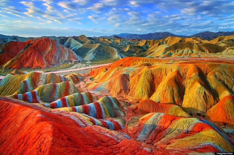 Тепер ми в Китаї. Скелі Чжанъе Дансья — це формування з скель, що розмалював невидимий художник в різні кольори – зелений, помаранчевий, жовтий, червоний і сіро-блакитний. Краще дивитися цю красу на світанку або заході сонця, коли скелі сяють різними відтінками і змінюють весь час колір.