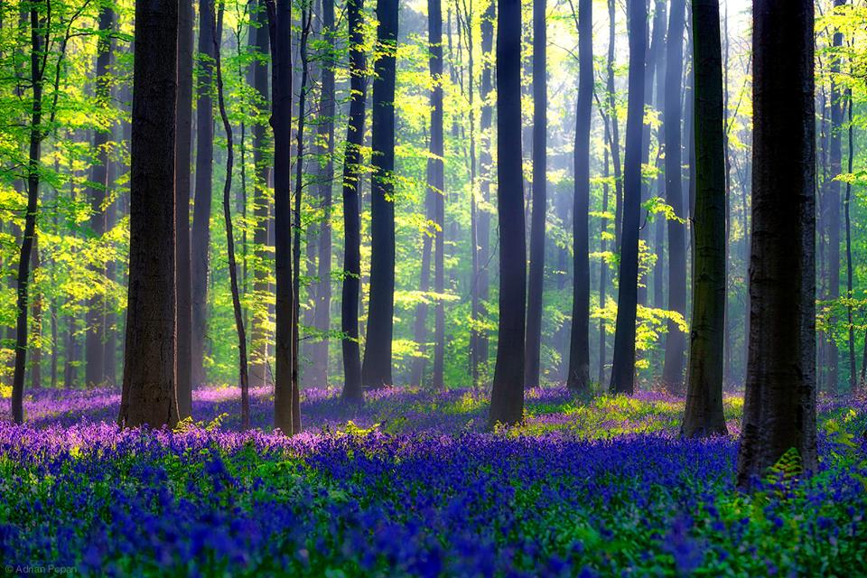 Бельгія. Кожну весну ліс Халлербос перетворюється в дивовижне місце в синіх відтінках. Це диво створюють море квітучих дзвіночків. Синеющая краса покривалом розстеляється по всьому лісі і створює чарівний вид. При сонячній погоді, коли промені сонця проникають крізь зеленіючі крони дерев, вид особливо казковий.