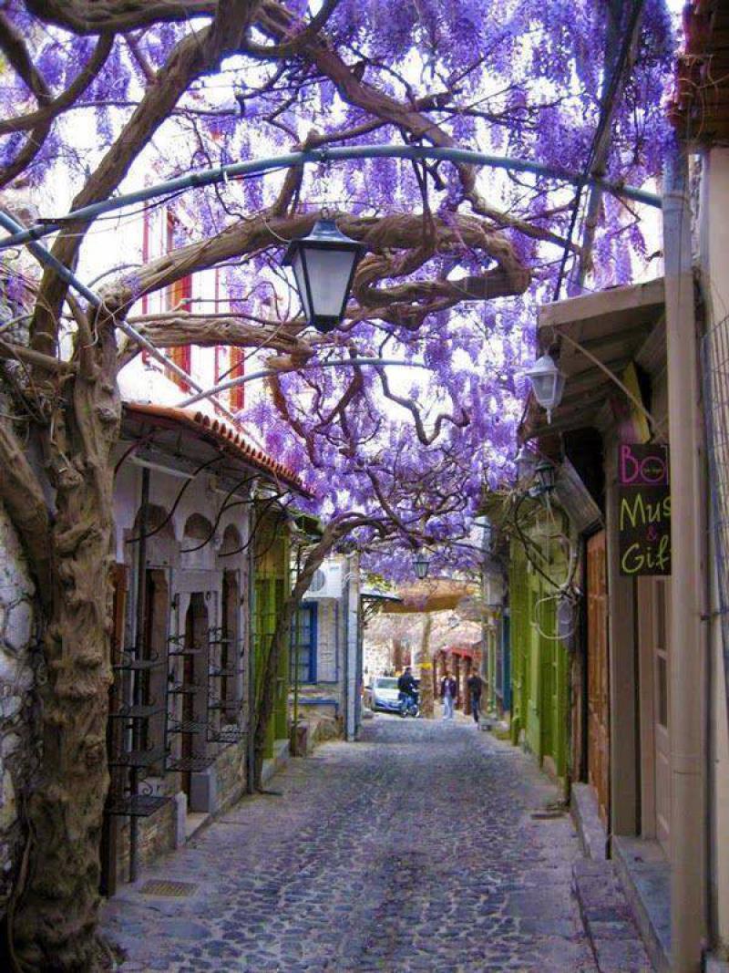 Моливос – це прекрасна маленька село в Греції і найкрасивіше місце країни. Її вулицю не можна не відзначити. Головна вулиця села вимощена каменем, а обрамляють її гліцинії. Вулиця як би закутана гілками цієї незвичайної рослини і весь час перебуває в тіні. А коли гліцинія цвіте, все навколо набуває ніжний, фіолетовий колір.