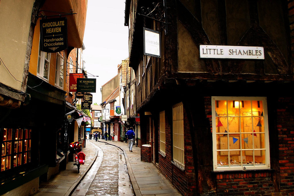 Англія. Місто Йорк. Вулиця Шамблес – це краса старовинних будівель з дерев’яними каркасами і незвичайними вигинами. Пройшовшись по цій вулиці, здивуєшся тому, як можуть ці хитромудрі будинку нависає прямо над головою.