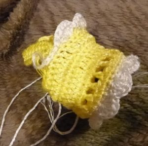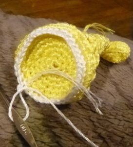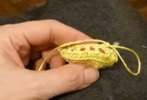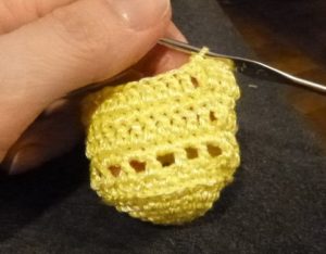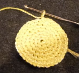 - 1-й ряд: набрати в кільце 13 СТ б/н 2-й ряд: подвоїти петлі (кожен СТ б/н — 2 СТ б/н) = 26 п. 3-й ряд: в’язати без додатків. 4-й – 9-й ряди: зробити по 2 додавання через ряд = 32 п. 10-й ряд: 32 СТ б/н. 11-й ряд: збавляння: 2 СТ б/н, 2 СТ б/н разом, повтор — до кінця ряду. 12-й ряд: 1 СТ б/н, 2 СТ б/н разом, повторювати до кінця ряду. 13-й ряд: 2 СТ б/н — і повторювати до кінця ряду.