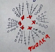 - зв’язати в кільце 8 стовпчиків з накидом (СТ з/н), чергуючи з 1 повітряної петлею (ВП). Далі в’язати дно за схемою: