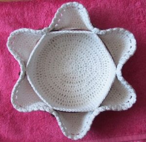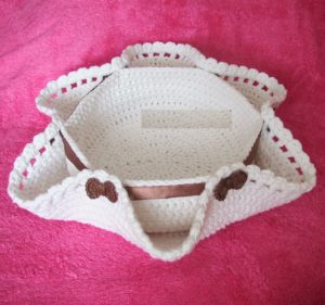 - потім необхідно пов’язати стінки кошики без додатків. 1-й – 2-й ряд: 1 СТ з/н, 1 ВП, повторювати до кінця ряду. 3-й – 7-й р.: 1 пишний стовпчик (3 СТ з/н з однією вершиною), 1 ВП повторювати до кінця ряду. 8-й ряд: 1 СТ з/н, 1 ВП, повторювати до кінця ряду. Закінчити в’язання, відрізати і закріпити нитку.
