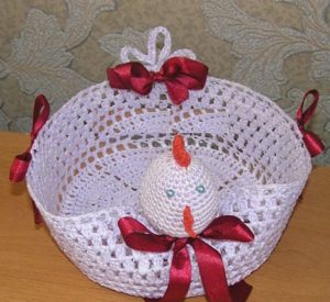 Великодній кошик гачком – один з прекрасних варіантів святкової вироби, яка може бути застосована як в якості декору, так і в практичному плані. Ті, хто хоч трохи вміють володіти гачком, можуть спробувати самостійно зв’язати одну з представлених великодніх кошиків.