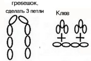 - арочки (1-й ряд): 1 стовпчик з накидом, 1внутренняя петля, пропустити 1столбик попереднього ряду, 1 стовпчик з накидом — повторювати весь ряд;
