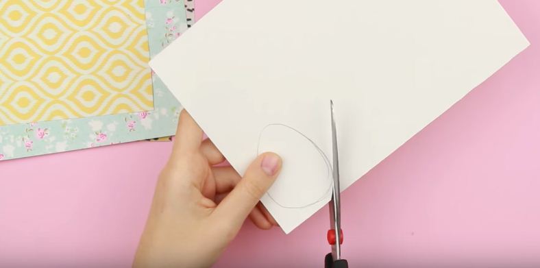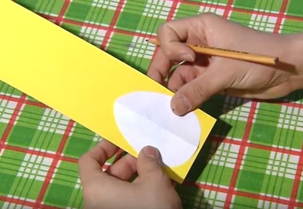 Прикладаємо шаблон яйця до картону жовтого кольору і простим олівцем обводимо.