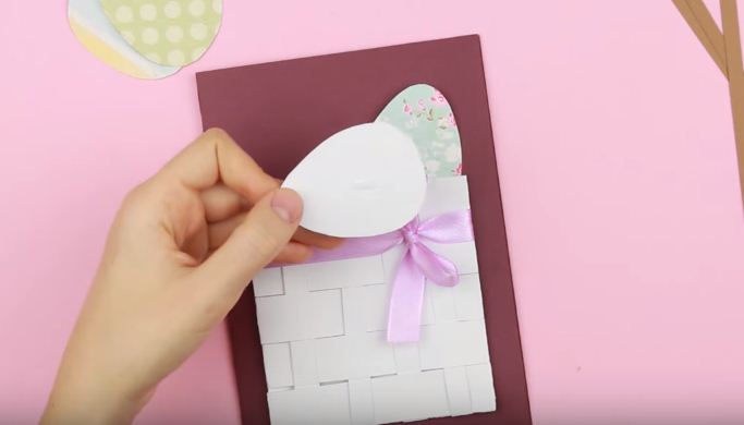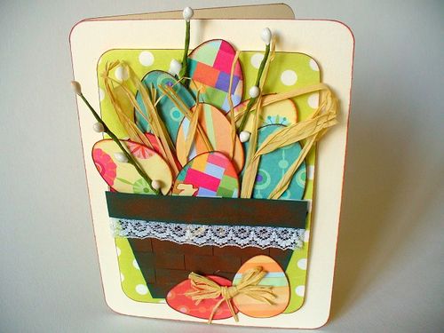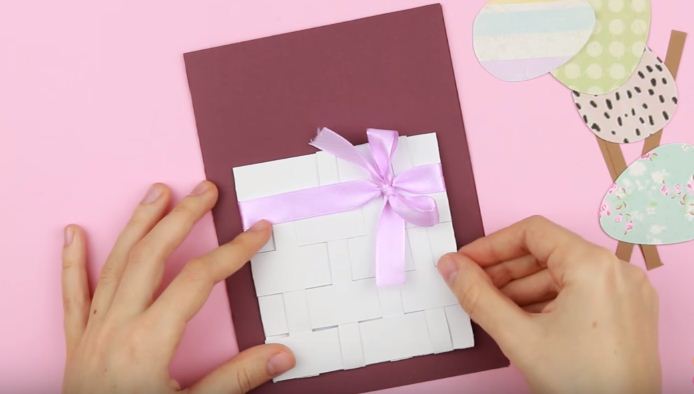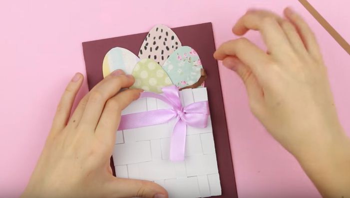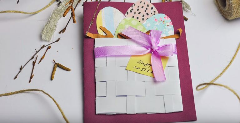Листівочка у вигляді білої плетеного кошика з бантиком і барвистих великодніх яєць. Вона достатня легка у виконання, але не менш красива.