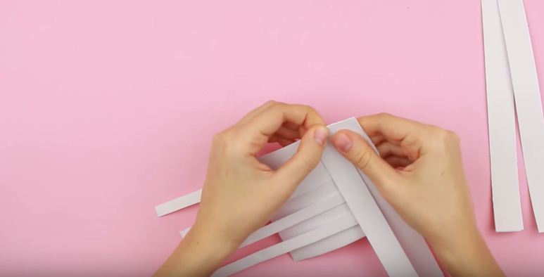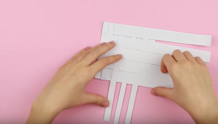 Смужки товстіший розміщуємо горизонтально. На відміну від тонких, вони розташовані щільно один до одного. З лівого краю також загнемо і приклеїмо.