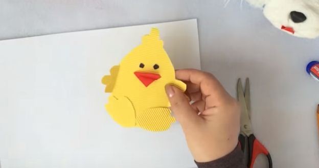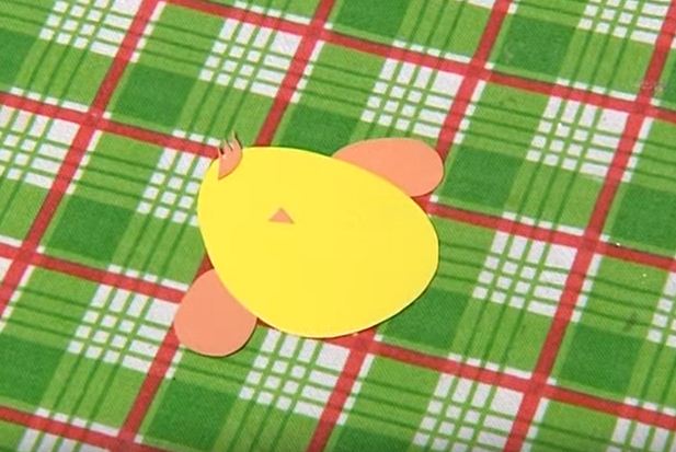 З картону жовтого кольору вирізаємо курчати і лапки. Їх приклеїмо внизу животика курчати. Чорним фломастером малюємо очі. А з паперу червоного кольору вирізаємо дзьоб і приклеюємо до мордочці курчати.