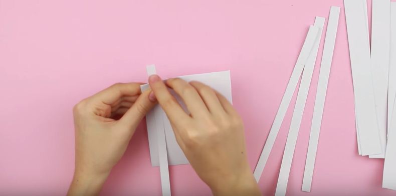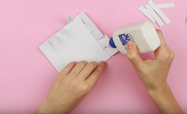 На невеликому прямокутнику білого кольору разлаживаем тонкі смуги. Це робиться вертикально. Зверху приклеюємо клеєм, попередньо загнув.