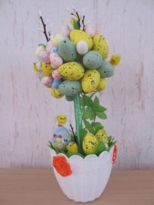 В якості основи до такого дереву використовують легкий невеликий матеріал, який обклеюють декоративними яйцями. Щоб заповнити місця між прикрасами, можна розбавити загальну картину живими чи засушеними квітами, паперовими метеликами.