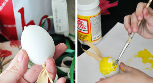 Яєчну шкаралупу також миють і залишають на сушку. Після того, як яйця готові, відрізають атласна стрічка (приблизно чверть метра), обпалюють і складають навпіл. На нижньому кінці потрібно зробити вузлик. Петельку стрічки просовують через яйце, фіксуючи за допомогою сайту внизу.