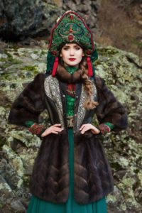 Образ з шубою і кокошником смарагдового кольору: