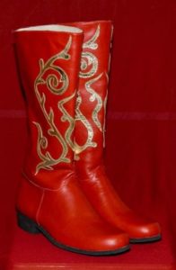 Що стосується взуття, до весільної сукні в російському стилі найкраще підійдуть червоні чоботи на невеликому каблучку. Під вкорочене платтячко варто вибрати високі чоботи зі шнурівкою.