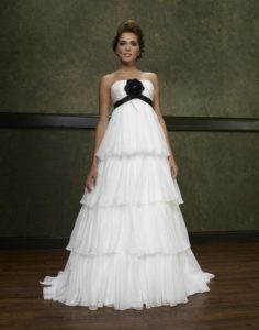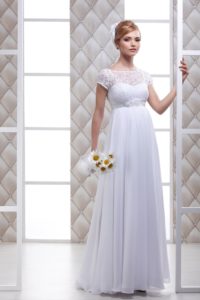 Якщо наречена вже на другому триместрі, але живіт ще не занадто виділяється, то краще в даному випадку звернути увагу на фасон із завищеною талією. Вітається в таких моделях наявність банта або рюші.