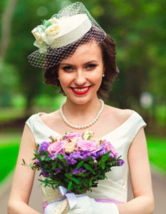 За бажанням фату можна замінити елегантною капелюшком з сіточкою, діадемою, вінком або іншим красивим прикрасою для волосся. Зачіска при цьому повинна повністю відповідати образу. Волосся можуть бути акуратно зібраними або розпущеним з завивкою.