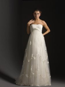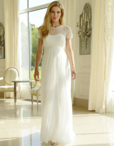 Хорошою альтернативою грецькому фасоном можуть стати сукні в стилі ампір. У даних моделях також роблять акцент на грудях. Найчастіше вони мають довжину максі. Але на відміну від грецьких моделей, стиль ампір зазвичай представлений простим мереживним весільним платтям для вагітних з довгим рукавом.
